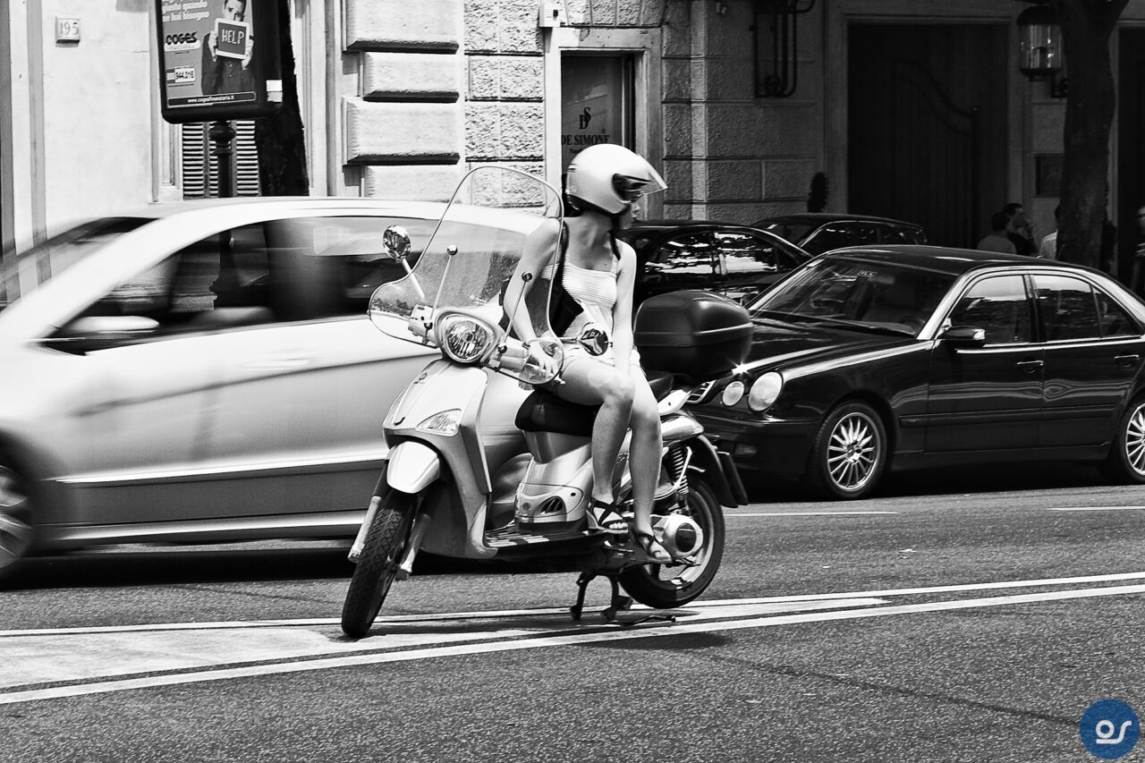 Junge Frau bleibt mit ihrem Roller im dichten Verkehr stehen, Rom, Italien