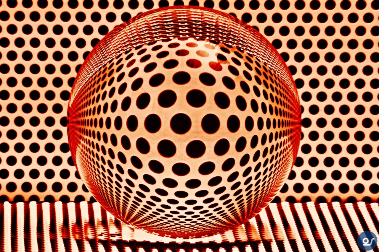 Fotokugel vor einer Lochwand