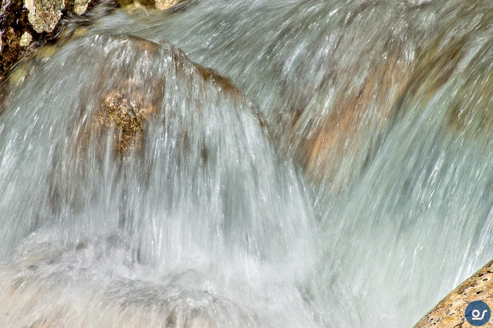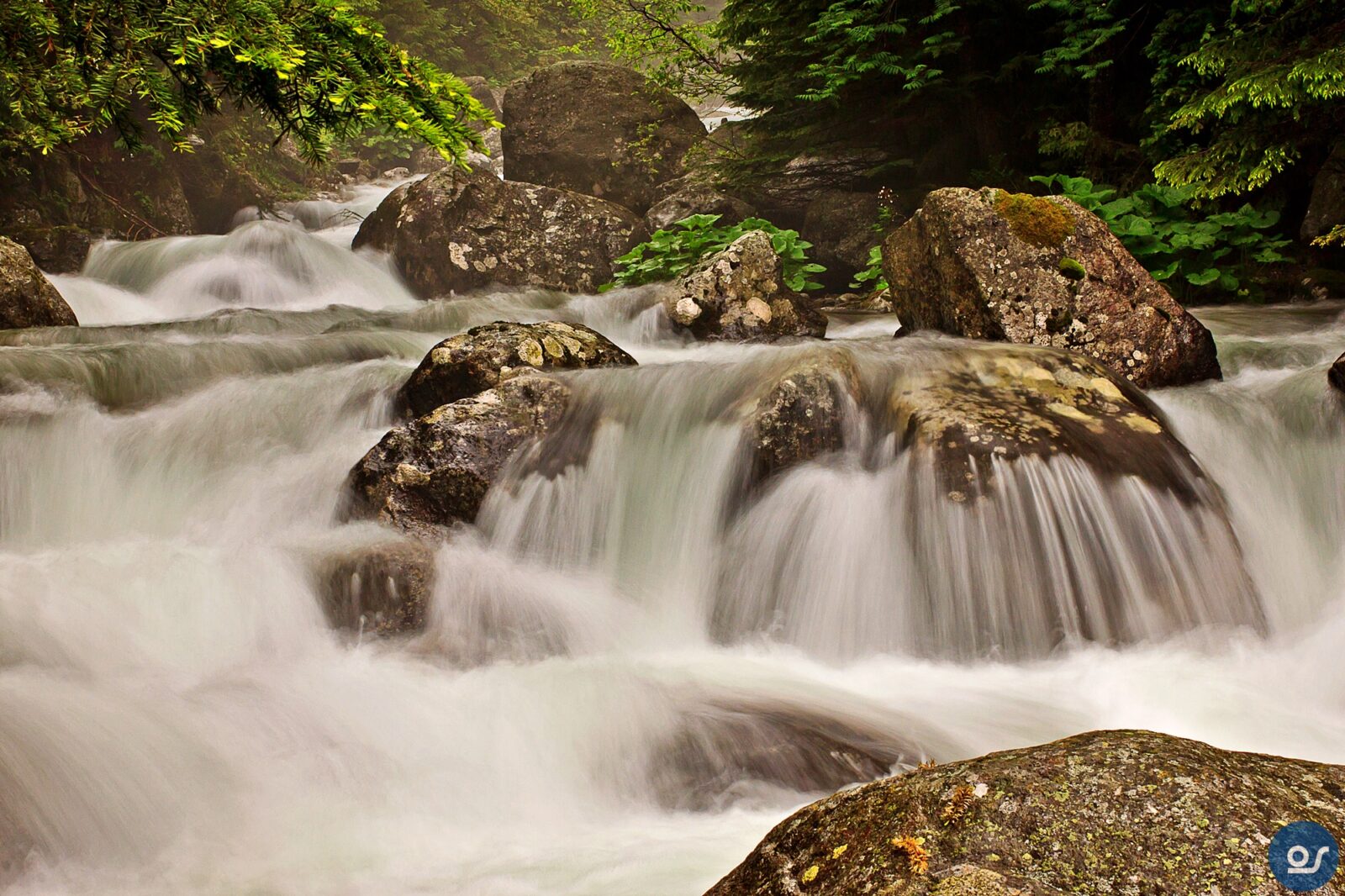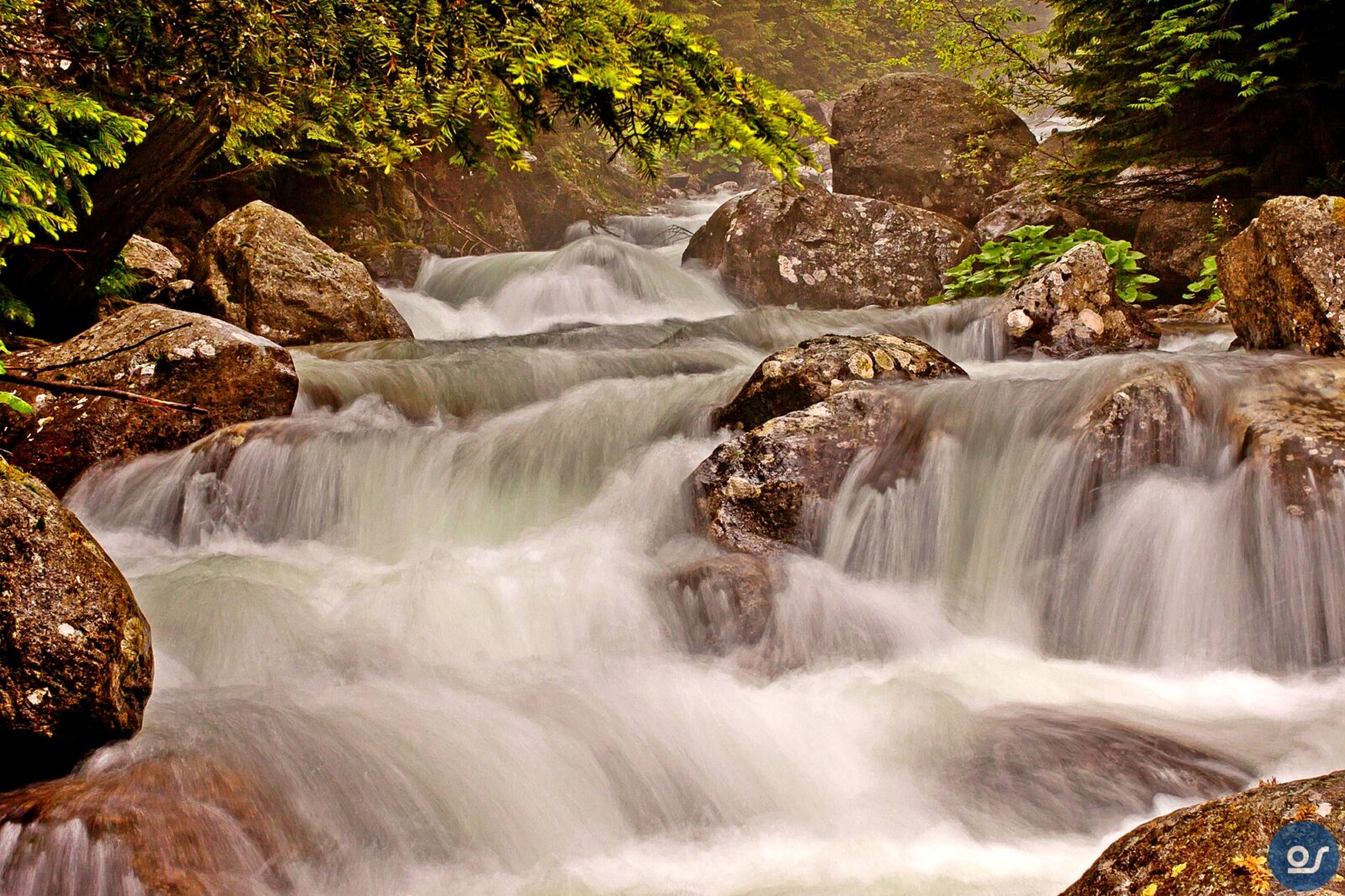 Wir waren jetzt genau in Höhe des Wasserlaufs, ich komme jetzt nicht mehr zu den Makros, aber in der Schnelle wollte ich noch ein paar Langzeitaufnahmen vom Bergbach hinbekommen. Dazu bin ich einen abenteuerlichen Abstieg über unbefestigtes Gelände zum Wasser hinunter gestiegen. Es war sehr glatt und man fand wenig Halt, zumal die Last auf dem Rücken noch auf geschnallt war. Ich war fast unten, da war es wieder der Schmerz im Knie. Nun gab es aber kein zurück. Der Regen wurde stärker. Ich suchte mir einen großen Stein auf dem ich ablegen konnte. Holte die Kamera raus , schraubte Adapter und ND Graufilter auf das Objektiv, stelle das Stativ auf und befestigte die Kamera daran.Auf den Felsbrocken war es nass und glatt. Es war gar nicht einfach das Stativ zu positionieren. Aber der Regen regte zur Eile an. Mir fehlte noch der Fernauslöser. Noch einmal über einige Klamotten zurück, in den Fotorucksack und dann zur Kamera zurück. Hoffentlich fällt sie nicht um. Die Wassertropfen liefen das Kameragehäuse hinab. Die Linse vorn war noch trocken, nun noch die Einstellungen suchen und abdrücken. So schoss ich ungefähr 10 Fotos, packte ein und kletterte den Hang wieder hinauf.