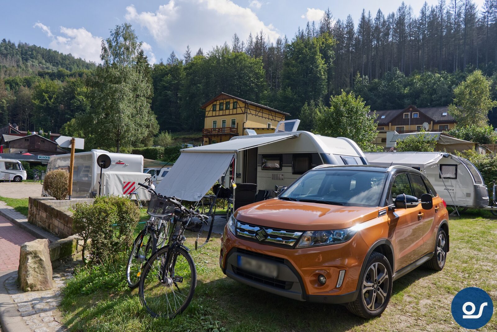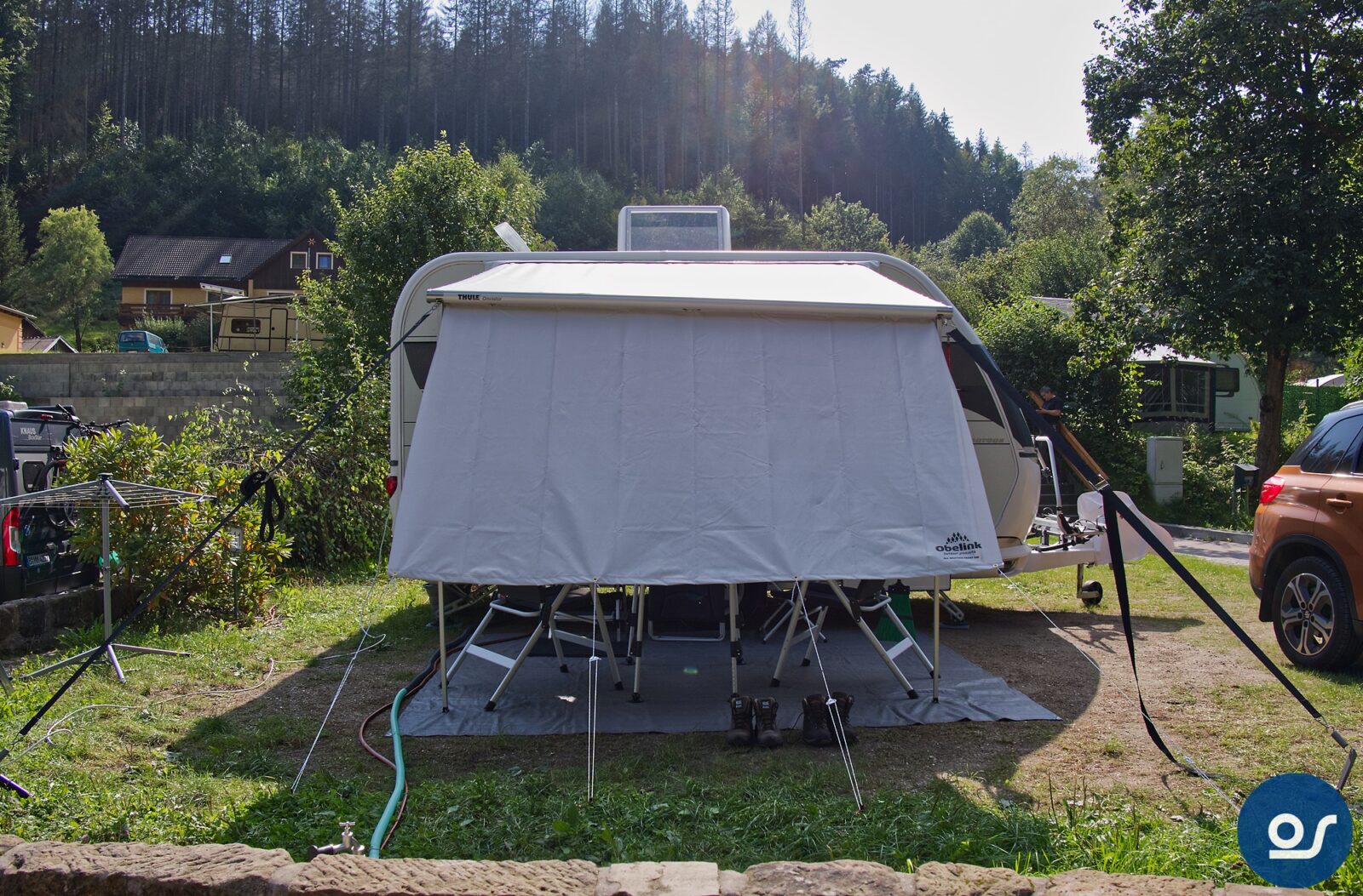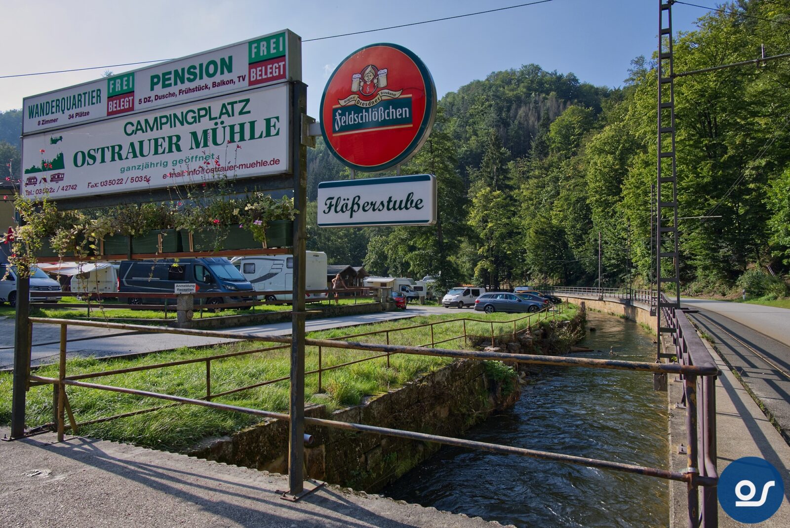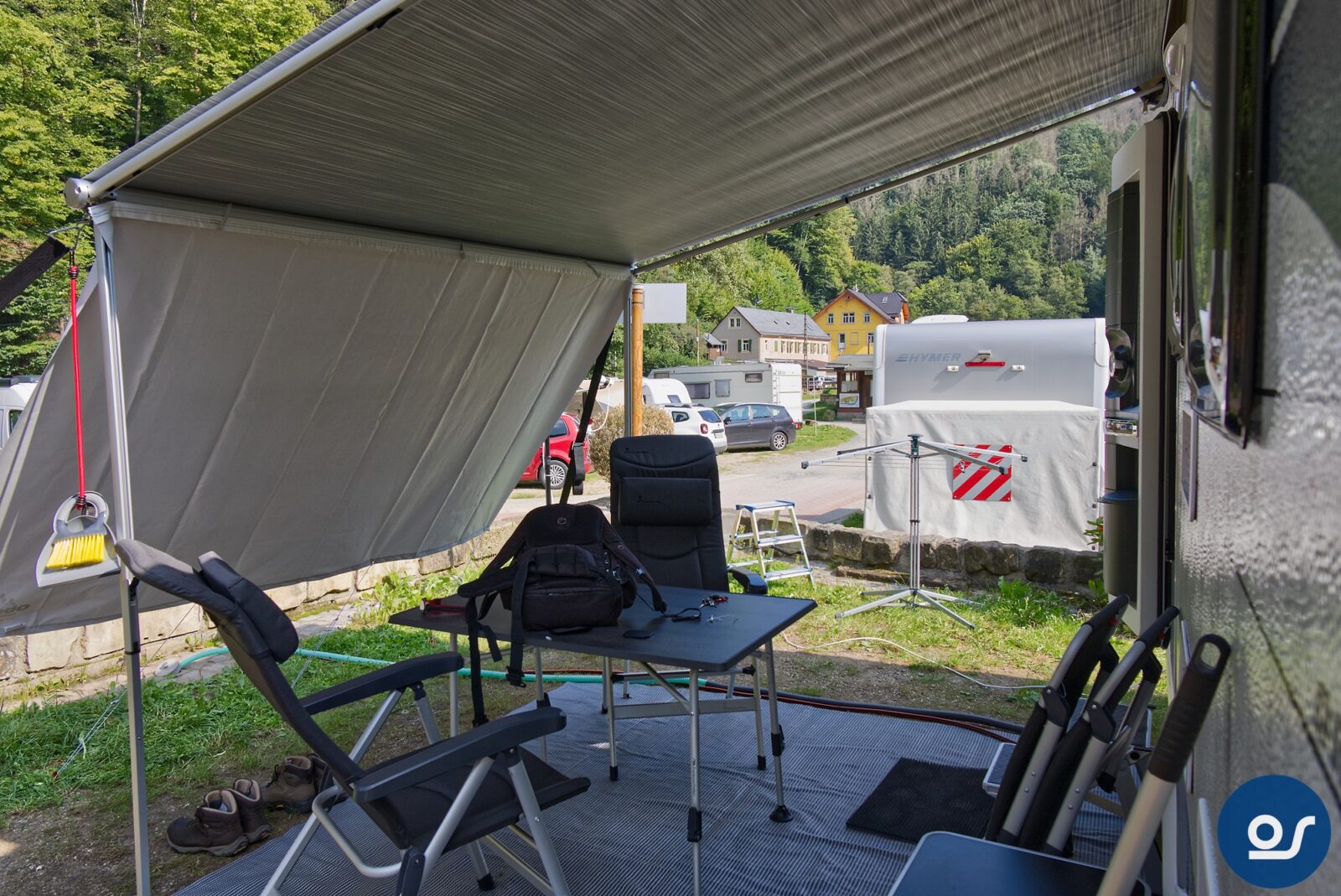 Freitag Abend. Schon Vorfreude auf morgen, dann geht es los zu unserem lange vorher geplanten und gebuchten Aktivurlaub in die Sächsische Schweiz. Da wir vor einiger Zeit auf dem Platz in Pirna waren und durch das Baustellen-Chaos um Dresden kutschierten, wollte wir dieses mal nur Landstraße fahren. Die Strecke war kürzer und wegen des zähfließenden Verkehrs auf der Autobahn auch schneller. Sie führte uns über Spremberg, Wittichenau, Kamenz, Bischofswerde und Neustadt. Das waren zusammen 183 km. Für die Strecke brauchte ich mit dem Wohnwagen 2,5 Stunden bis auf den Campingplatz. Die letzten 10 km waren haarsträubend. Die Straßen sehr eng. Zweimal kam uns ein Bus entgegen, den wir nur in Schrittgeschwindigkeit passierten. Kurven, hervorstehende Felsen und Fahrradfahrer waren meine letzten Hindernisse. Gegen 14 Uhr konnten wir auf unseren Platz, das hatten wir am Freitag noch telefonisch abgeklärt. Wir waren Punkt 14 Uhr auf dem Campingplatz Ostrauer Mühle. Meine Frau checkte uns ein. Wir bekamen den Platz Nr.41. Dieser Platz war mit Frisch- und Abwasser sowie E-Anschluss. Es war einer der wenigen oder wahrscheinlich der Einzige. Auf unserm Platz stand ein fettes Wohnmobil mit Anhänger und blockierte unseren Aufbau. Eigentlich sollst du gegen 11 Uhr den Platz verlassen haben, aber der Herr aus Baden-Württemberg hielt das nicht für nötig. So stand ich mit dem Gespann auf einer Fläche, die zum Rangieren von Womos oder Wowas genutzt werden konnte. Doch für unseren Verbleib auf dieser hatten alle angrenzenden Camper Verständnis. Gegen 14:30 Uhr kamen die beiden alten Herrschaften mit einem Quad angefahren und honorierten unser Vorhaben diesen Platz zu besetzen mit einem höhnischen Lächeln. Tja, so ist das nun mal mit der Zeit, bekamen wir zur Antwort. Als er dann endlich verschwunden war konnten wir mit dem Rangieren beginnen. Einparken konnte ich nicht. Das Einbiegen auf den Platz war zu spitzwinklig, ich hätte mit dem Heck das Ende des Fahrradträgers touchiert. So hingen wir ihn ab und schoben den Hänger rückwärts auf den Stellplatz. Ich nahm Maß mit dem Wasser- und dem Abwasserschlauch das ich auch mit der Länge hinkam. Alles passte. Ich koppelte den E-Anschluss an, schloss Wasser und Abwasser an, dann konnte es an den Aufbau gehen. Der Hänger war aufgebockt und ausgerichtet. Wir legten den Fußboden aus und bauten die Markise auf. Dann kam etwas neues dazu. Kurz vor unserer Abreise hatte ich mir einen Front-Regenschutz bei Obelink besorgt. Der kam auch noch am Freitag (Freutag). Der wird in die hintere Kederschiene eingezogen und mit vier Heringen abgespannt. So wird verhindert, dass bei Regen die Tropfen vorne von der Markise auf den Kunststoff Fußboden tropfen und zusätzlich hat man noch einen vorderen Sichtschutz.