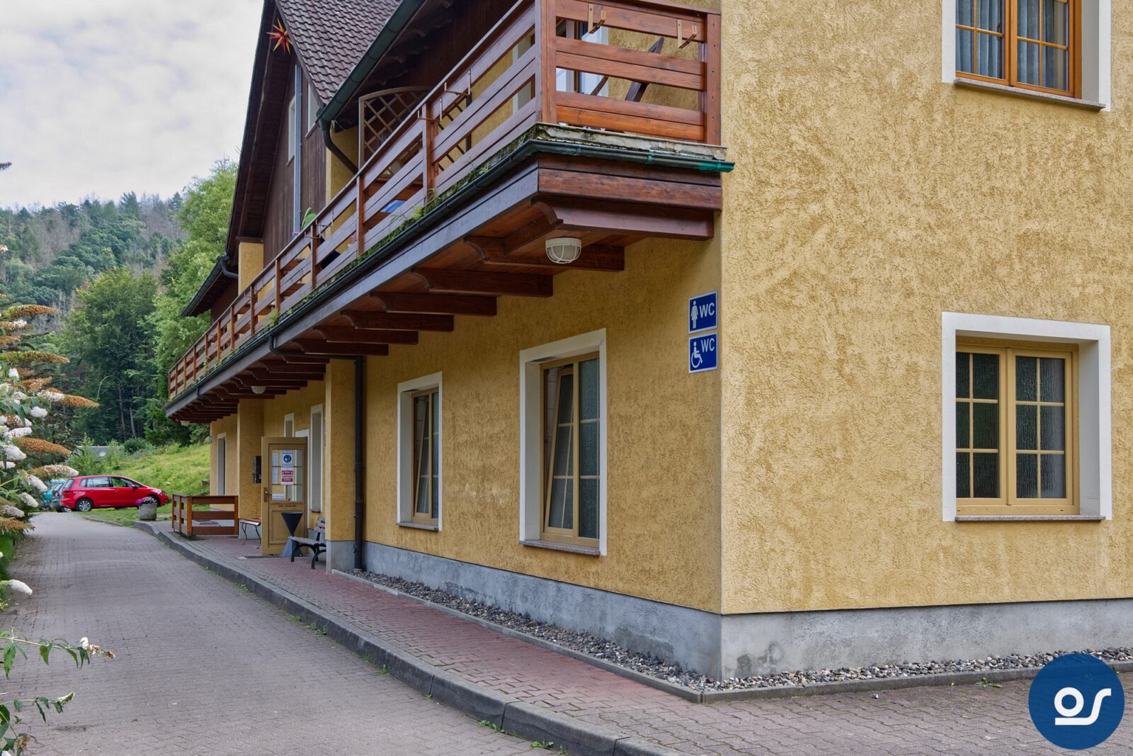 An der Rezeption konnte man Straßenbahn Fahrscheine erwerben, oder auch in der Kirnitzschtal Bahn selber. Ein Tagesticket im Normaltarif für einen Erwachsenen kostet 9 Euro. Dann befindet sich auch ein Kiosk am Empfang. Hier bekommt man allerlei Dinge des täglichen Lebens, sowie frühmorgens auch immer Brötchen, ohne Vorbestellung. Hinter dem Kiosk befindet sich eine ganz ordentliche Gaststätte, die Flößerstube. Besonders den Café und den selbstgebackenen Kuchen kann ich empfehlen, auch das frisch gezapfte Fassbier ist eine immer willkommenen Erfrischung. Auch das Personal in dieser Gaststätte ist freundlich und hilfsbereit. Doch Verpflegung hatten wir zu Hause gebunkert. Der Kühlschrank war voll, so dass wir nur zwei Mal dort eine Erfrischung genossen hatten. Das Angebot an Freizeit Aktivitäten ist in der Sächsischen Schweiz so reichhaltig wie nirgends in der Republik. Allerdings sollte man immer gut zu Fuß sein und vor allem, immer gutes Schuhwerk dabei haben. Wanderschuhe sind von Vorteil. Meine habe ich täglich genutzt. Wir hatten auch unsere Fahrräder dabei und haben diese sogar an zwei Tagen genutzt. Mehr zu unseren Aktivitäten dann in den nächsten Berichten.