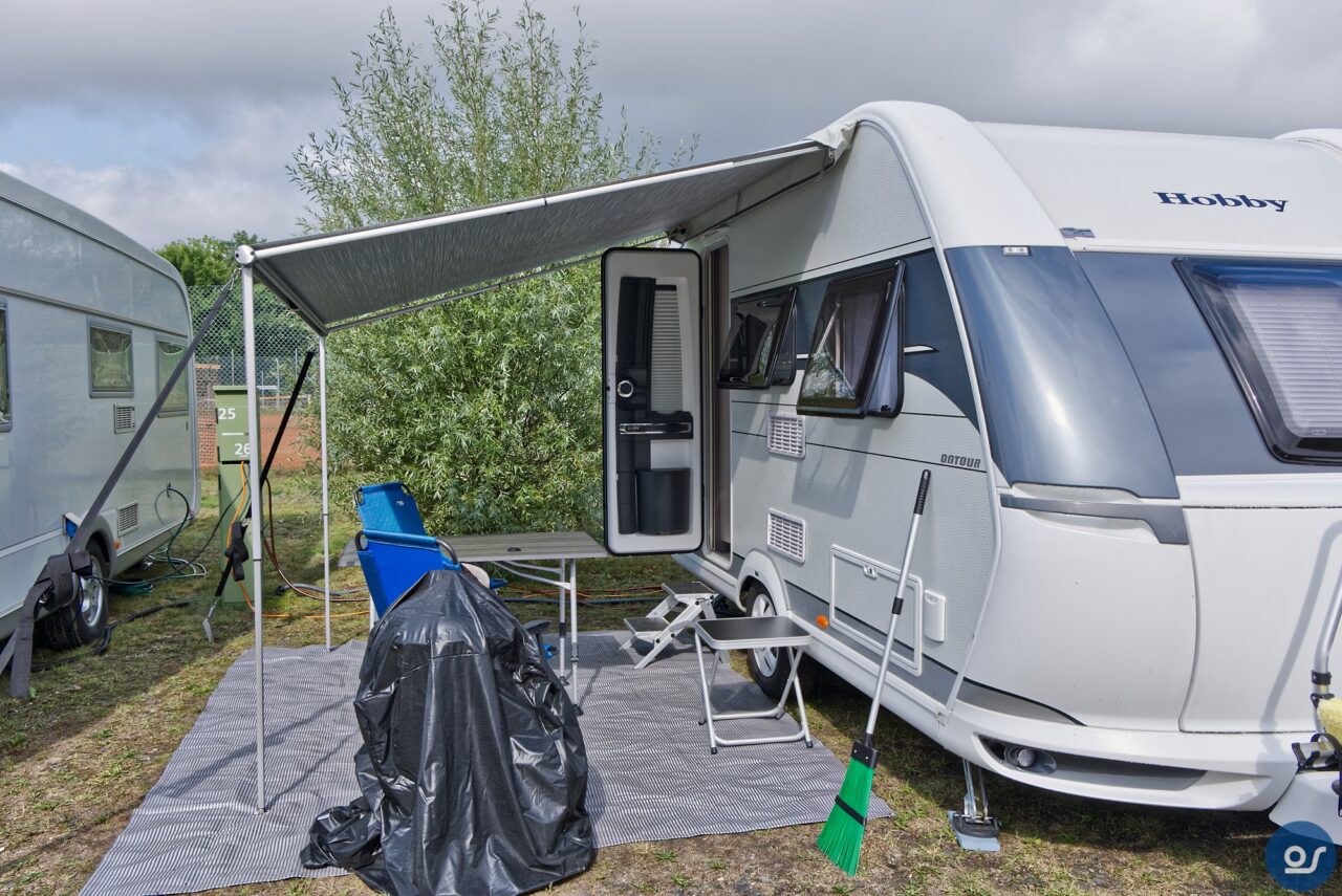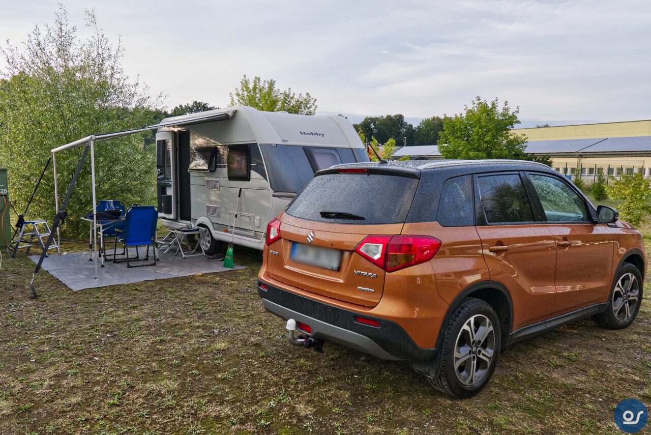 So meinen Stellplatz habe ich bezogen. Zwar ist alles nass und es sieht so aus als das es gleich wieder anfängt zu regnen, aber ich habe mich entschlossen die Markise und den Teppich aufzubauen. Das war eine gute Entscheidung, denn es fing gerade an zu regnen. War ja mein Wunschwetter. Nun noch die Sturmbänder festmachen, dann kann es an das Feintuning gehen. Der Boden war knochenhart. Dieses Mal hatte ich einen Steinbohrer mit dabei. Mit dem Akkuschrauber und dem Bohrer stieß ich vor, um in das Loch den Hering zu prügeln. Das funktionierte gut und hätte ich in Pirna auch gebrauchen können.