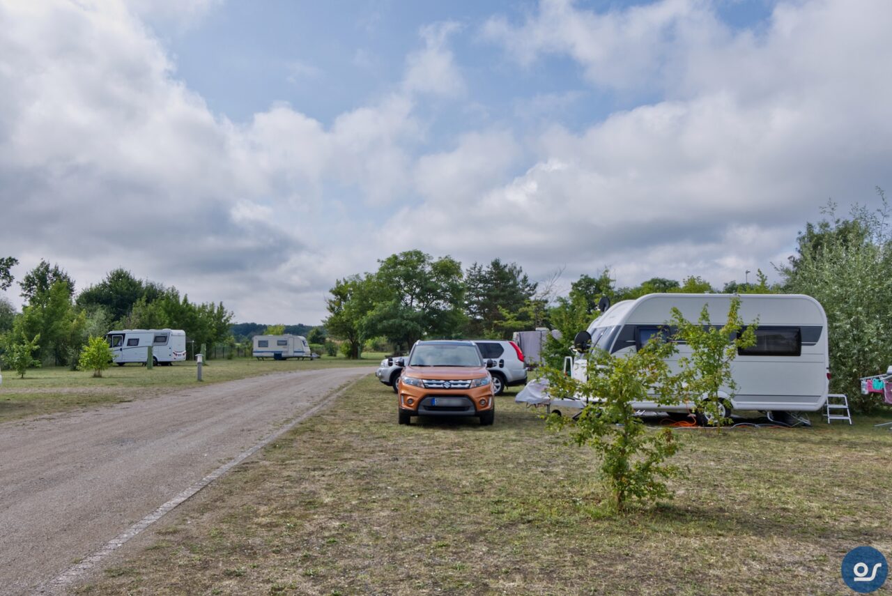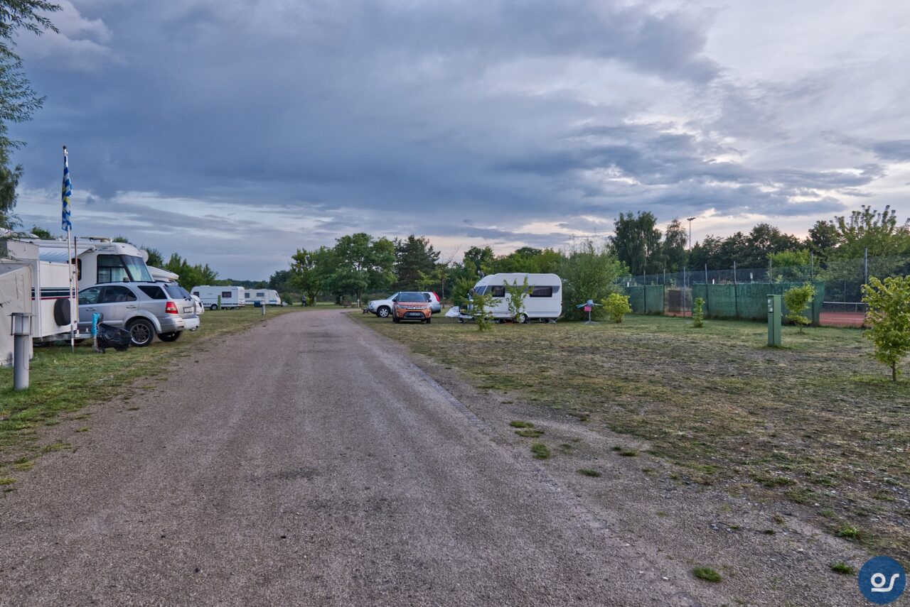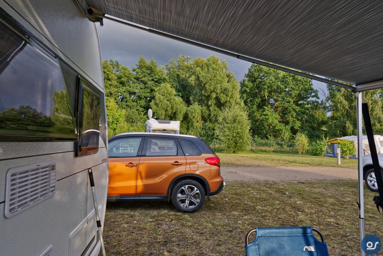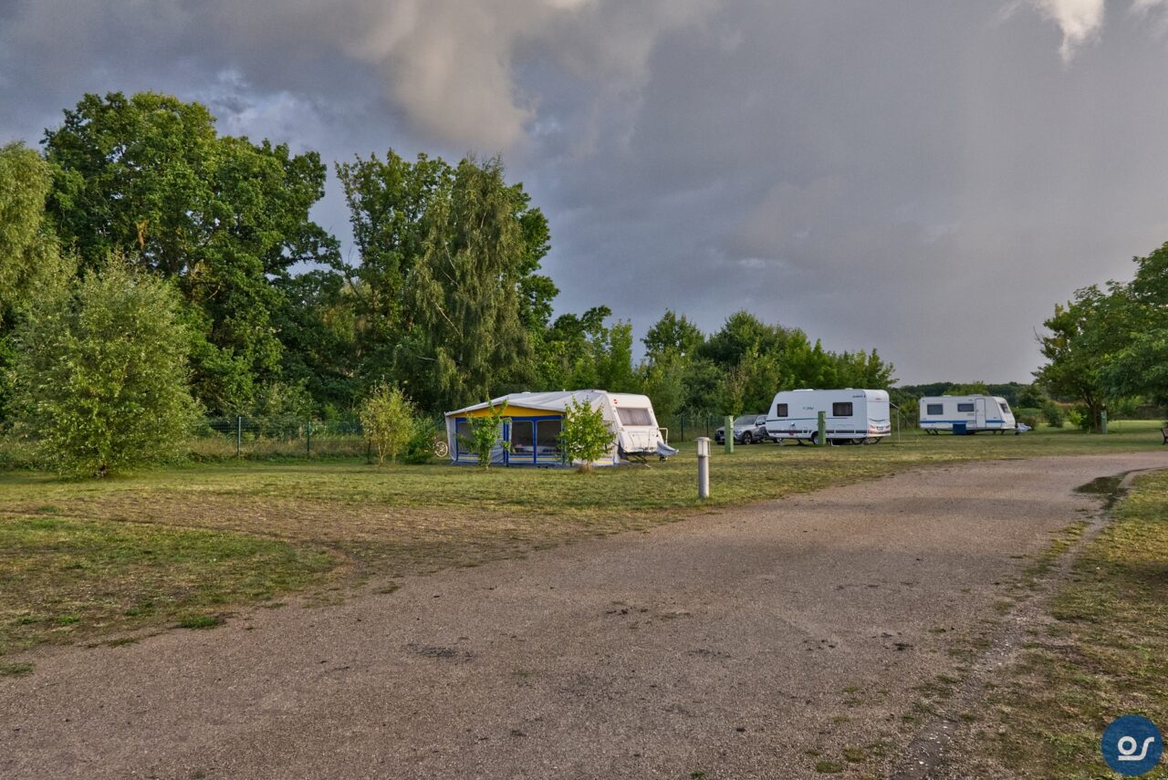 Auf der Fahrt dorthin regnete es stark. Wolkenbruchartig ergoss sich der Regen über unser Gespann. Genauso wollte ich es haben. Bisher waren wir mit dem Hänger nicht groß im Regenwetter unterwegs. So konnte ich dann feststellen ob er dicht war. Und er war dicht. Wir kamen in Beeskow an und der Regen hörte auf. Gebucht war wieder ein Komfortplatz, mit Strom, Wasser und Abwasser inklusive. Duschen und Toilettennutzung sowie Fäkalienentsorgung und Müllanlage alles war im Preis mit inbegriffen. Und der war heiß. Hier kostet die komplette Übernachtung für 2 Personen mit Stellplatz und allem Drum herum 20 Euro. Der Platz ist sauber und sehr aufgeräumt. Die Müllanlage verschlossen und auch sehr sauber. Die Fäkalienentsorgung befindet sich in der Nähe des Toilettenhäuschens unter freien Himmel und kann mit dem Transponder den man beim Einchecken erhält in Gang gesetzt werden. Übrigens verlief das Einchecken unter 2 Minuten, gibt es da noch Fragen? Gleich daneben das Sanitärgebäude. Männer und Frauen haben hier jeweils 2 WC-Kabinen und 2 Duschkabinen zur Verfügung. Diese werden über einen Boiler gespeist, man braucht also kein Kleingeld oder Chips um das Warmwasser in Gang zu setzen und kann duschen so lange warmes Wasser im Boiler ist.