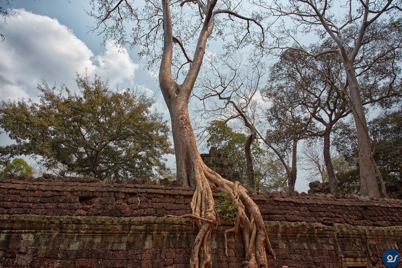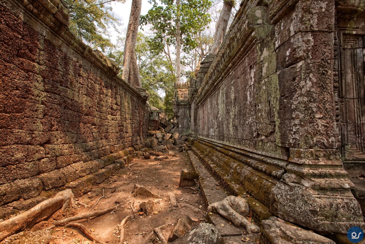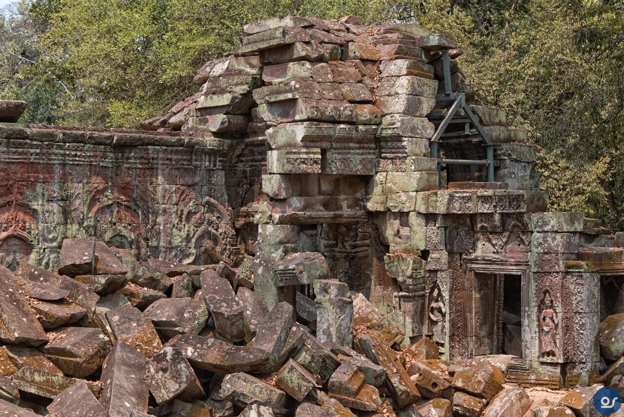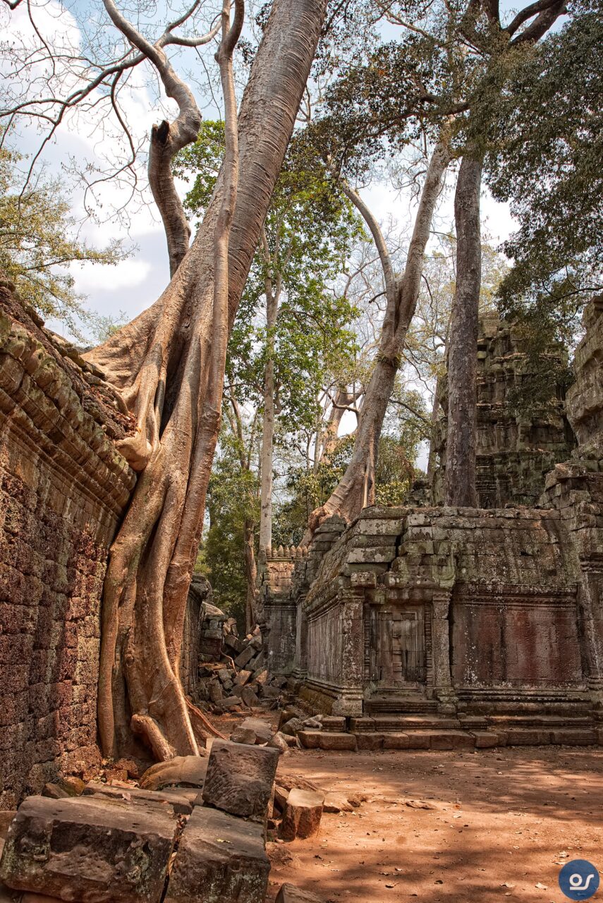 Die Anlagen in Ta Prohm sehen nicht mehr ganz so toll aus. Teilweise eingefallene Gebäude und Mauern. Einerseits sind die weit verbreiteten Würgefeigen Schuld, deren Wurzeln sich schadlos an der Bausubstanz laben. Nun erfolgt die Restaurierung eines Tempels im Eingangsbereich. Der Rest wurde von Bauschutt, Steinen und Bäumen befreit um den Besuchern einen gefahrlosen Rundgang zu ermöglichen.