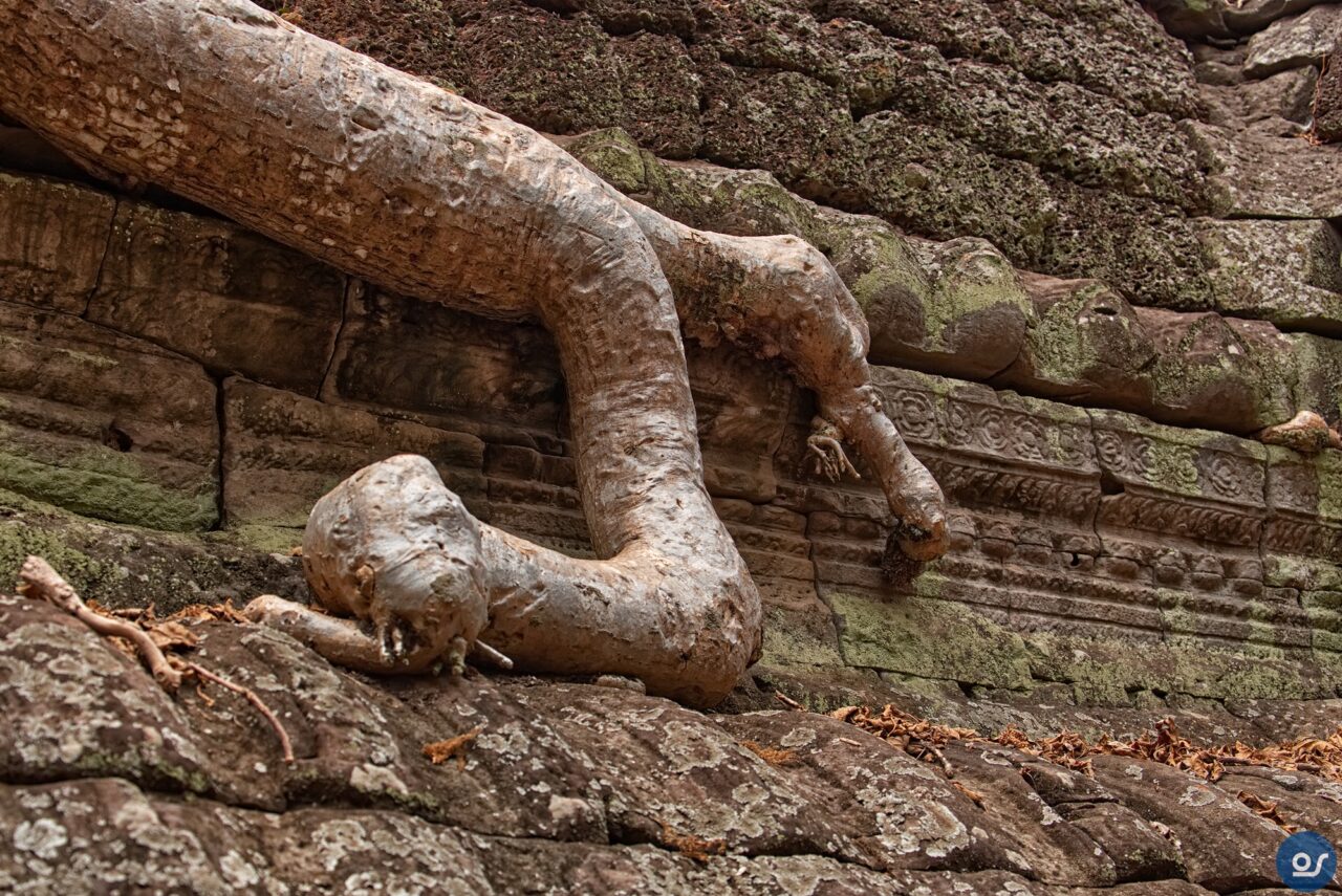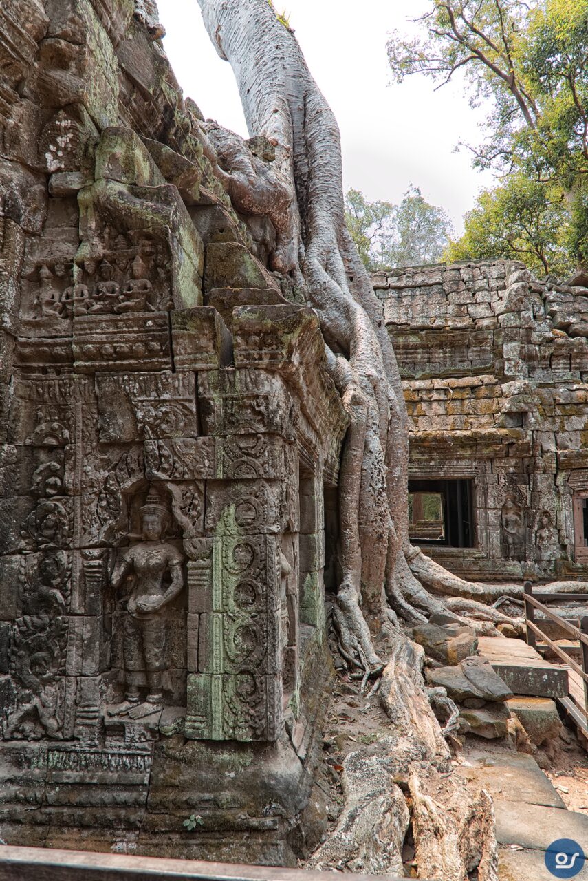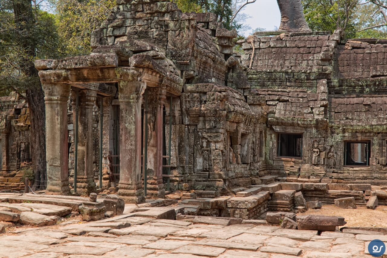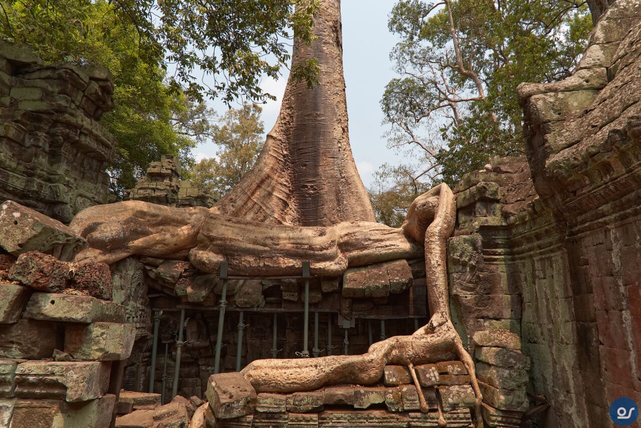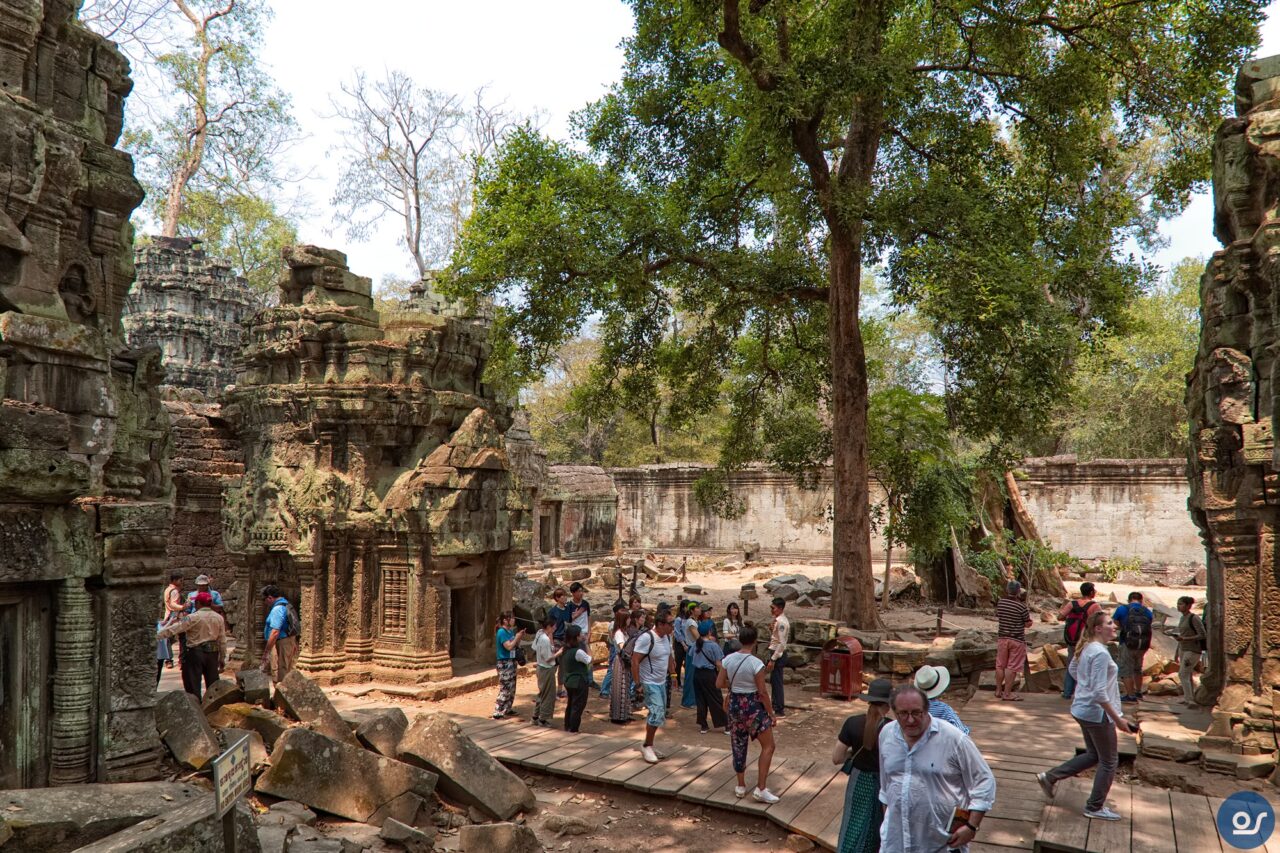 Die Anlagen in Ta Prohm sehen nicht mehr ganz so toll aus. Teilweise eingefallene Gebäude und Mauern. Einerseits sind die weit verbreiteten Würgefeigen Schuld, deren Wurzeln sich schadlos an der Bausubstanz laben. Nun erfolgt die Restaurierung eines Tempels im Eingangsbereich. Der Rest wurde von Bauschutt, Steinen und Bäumen befreit um den Besuchern einen gefahrlosen Rundgang zu ermöglichen.